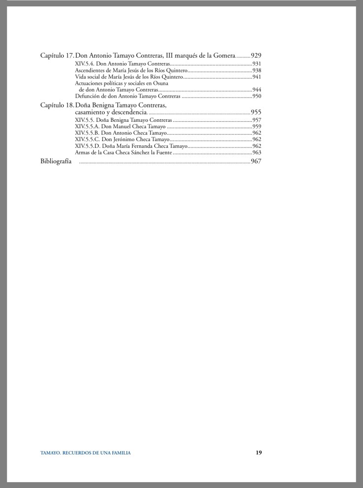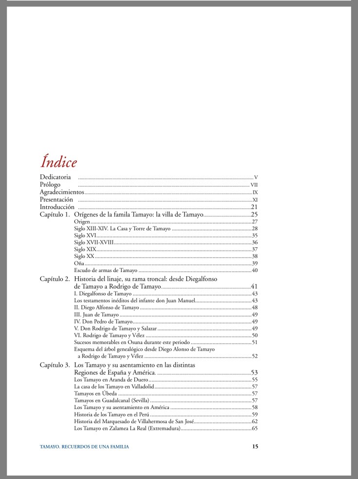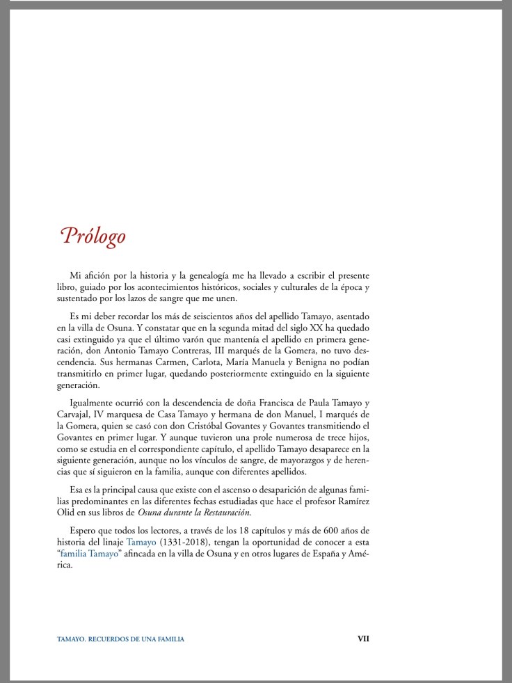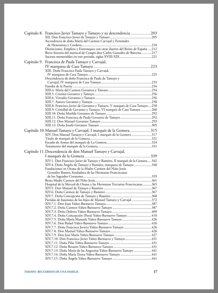 Un impresionante trabajo sobre los más de 600 años de historia, en sus 18 capítulos y casi 1.000 páginas, donde nos muestra un estudio serio y riguroso de la gran familia Tamayo radicada principalmente en Osuna y Écija y sus entronques con las mayores familias nobiliarias españolas, así como las diferentes ramas a las que dieron lugar en su contexto socio-político y cultural. Todo ello documentado hasta el extremo y con profusión de fotografías familiares, imágenes y láminas y enmaquetado deliciosamente.