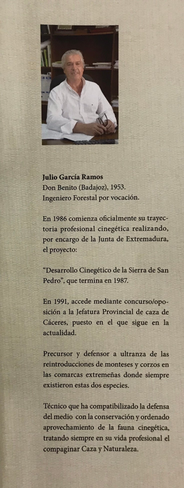 Permitidme hacer un guiño a mi región, Extremadura y un homenaje al magnífico libro de mi buen amigo don Julio García Ramos que se presenta en el día de hoy. Es una reivindicación de nuestro patrimonio natural, la Cabra Hispánica y que puede interesar mucho a nuestro grupo, a todos nosotros. Además incluye un estudio genealógico que el autor hace de las familias propietarias como los Escriba de Romani, los Maldonado, y los Condes de Villagonzaloy otros. Además presenta toda la Guardería desde hace más de 150 años. Presenta fotografías únicas, inéditas y de importante documentación que clarificará cual es el primer Coto de la Sierra de Gredos.
