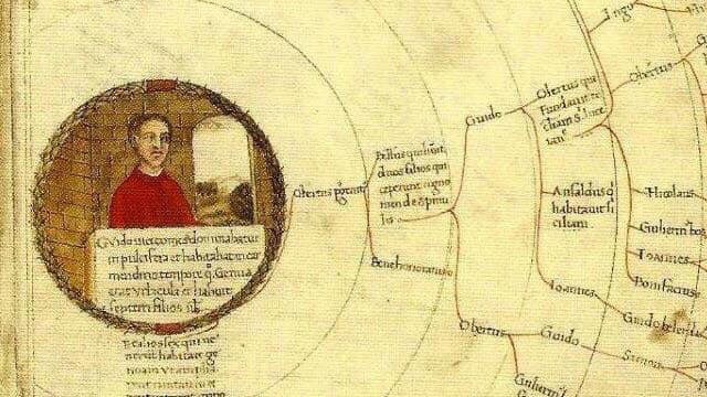 Árbol genealógico de la Familia Spinola con la miniatura de Guido, Vizconde de Val Polcevera, antepasado de Guido Spinola, pergamino manuscrito del siglo XVI