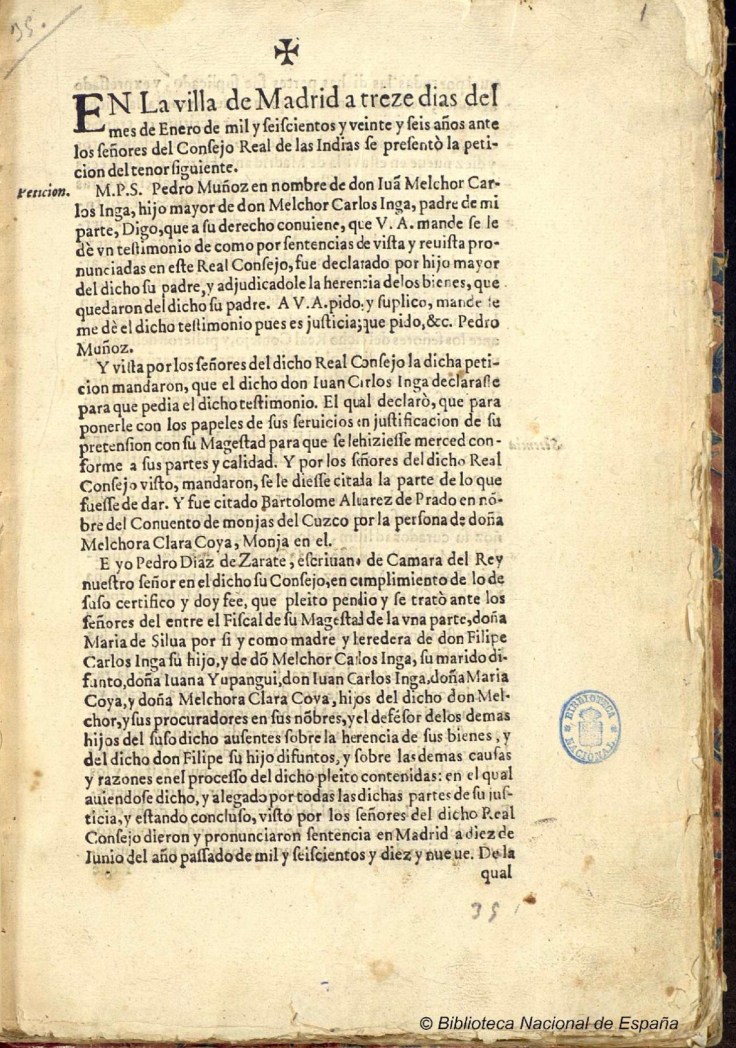 Petición presentada ante el Consejo de Indias por D. Juan Melchor Carlos Inga para que se le diese testimonio de la sentencia en que fue declarado hijo mayor de su padre D. Melchor Carlos Inga, y como tal se le adjudicó la herencia de este, Madrid, 9 mayo 1626 (h. 1-6v).