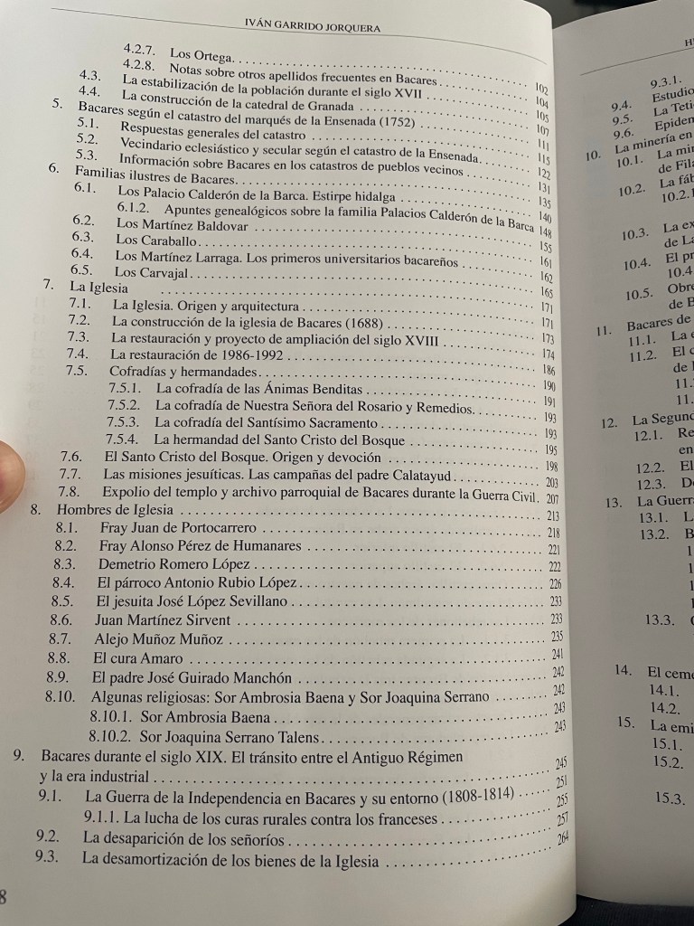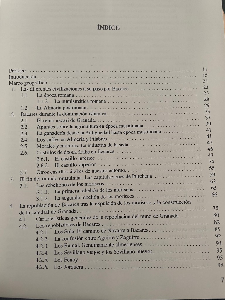 Historia general de la villa de Bacares (Almería) Monumental trabajo de nuestro compañero don Iván Garrido Jorquera que a pesar de su juventud se perfila como una gran promesa para la Historia. Toda una sorpresa, riguroso y serio pero a la vez asequible (por capítulos lógicamente) para todos los públicos. Adjunto el índice pues los dedicados a los primeros repobladores, catastro, las familias ilustres y la Iglesia creo que harían las delicias de muchos de nuestros seguidores. Muchísimas gracias por este inesperado regalo que demuestra una vez más los grandes trabajos que se desarrollan en la muchas veces ignorada Historia local. Felicidades!