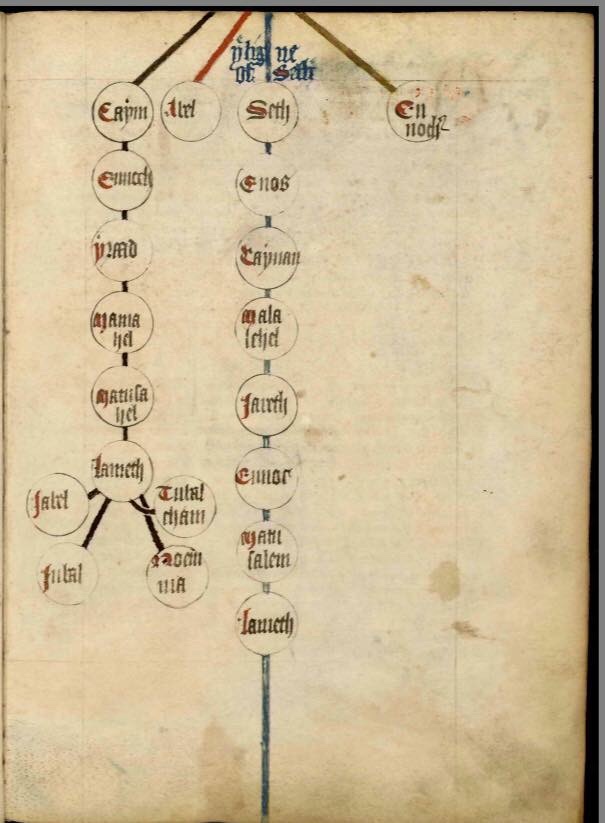 En este manuscrito, realizado en Londres alrededor del 1500, se rastrea la genealogía de los reyes de Inglaterra desde Adán y Eva hasta Ricardo III. El manuscrito tiene el estilo de William Caxton (ca. 1422-1492), el primer impresor inglés. Este volumen, escrito en inglés sobre papel vitela, conserva su encuadernación original de ternero marrón. Las ilustraciones, en su mayoría, son grandes composiciones en pluma y tinta e incluyen imágenes del Juicio Final y la caída de los ángeles rebeldes, la Creación, la caída de Adán y Eva, y el arca de Noé. También hay una serie de cadenas genealógicas, decoradas con 68 retratos en medallón. Entre los reyes y emperadores representados están Alejandro el Grande, Carlomagno, el rey Arturo y Guillermo el Conquistador. Las decoraciones secundarias abarcan iniciales decoradas con filigrana de oro y otras rubricadas en tinta roja y azul.