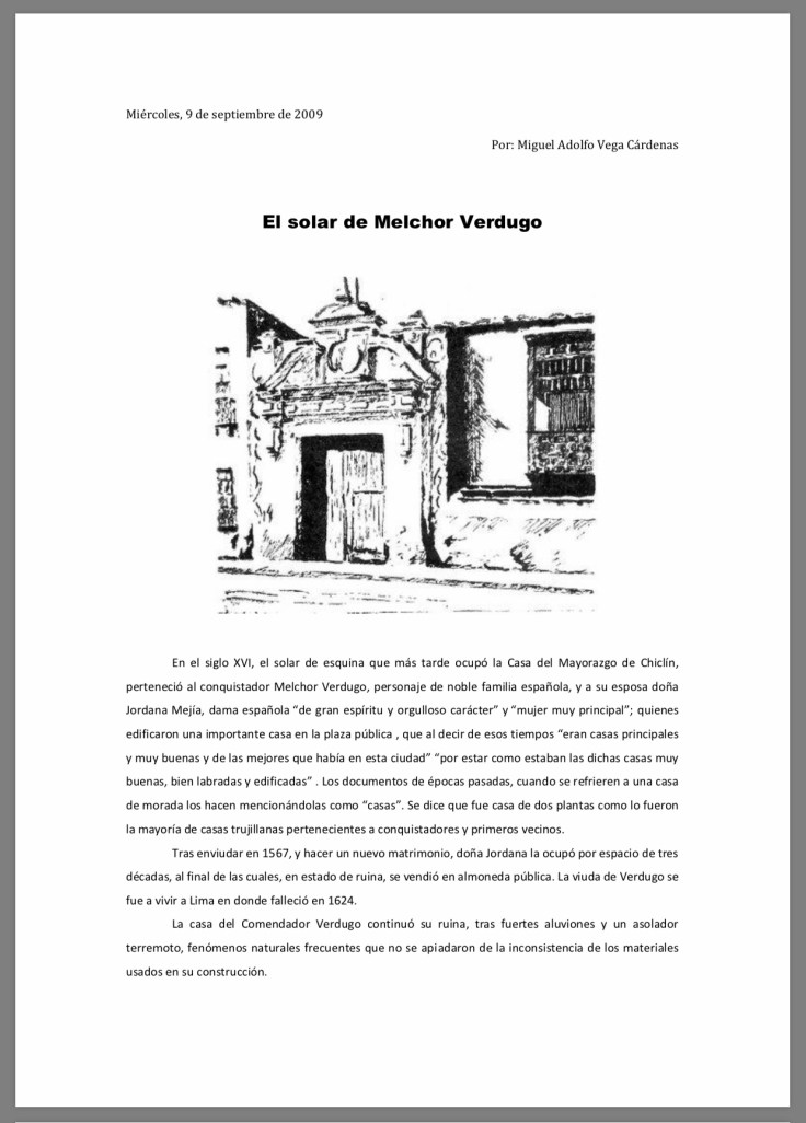El Solar de Melchor Verdugo. El solar de Melchor Verdugo Por don Miguel Adolfo Vega Cárdenas, 2009. IR AL DOCUMENTO Comparte esto: Compartir en X (Se abre en una ventana nueva) X Comparte en Facebook (Se abre en una ventana nueva) Facebook Compartir en LinkedIn (Se abre en una ventana nueva) LinkedIn Compartir en Tumblr (Se abre en una ventana nueva) Tumblr Haz clic en Pinterest (Se abre en una ventana nueva) Pinterest Me gusta Cargando...
