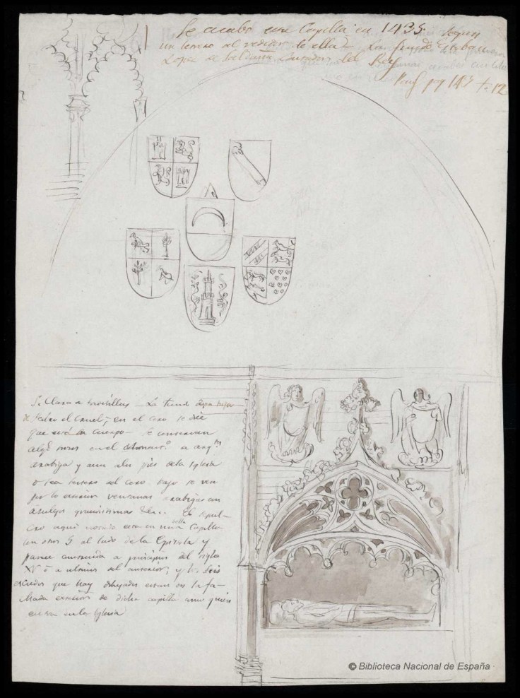 Apuntes tomados en el Monasterio de Santa Clara de Tordesillas: el superior representa escudos nobiliarios y la Capilla del Contador Fernán López de Saldaña, situada al lado de la Epístola con la representación de seis escudos; el inferior muestra el sepulcro en arcosolio.