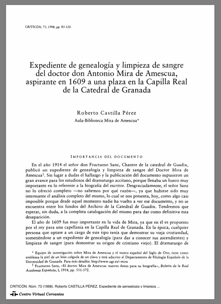 Expediente d e genealogía y limpieza d e sangre del doctor don Antonio Mira d e Amescua, aspirante en 1609 a unaplaza en la Capilla Real de la Catedral de Granada