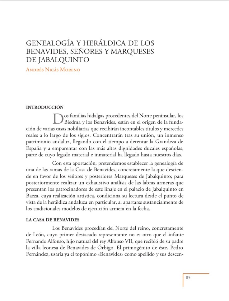 Genealogía y heráldica de los Benavides, Señores y Marqueses de Jabalquinto.