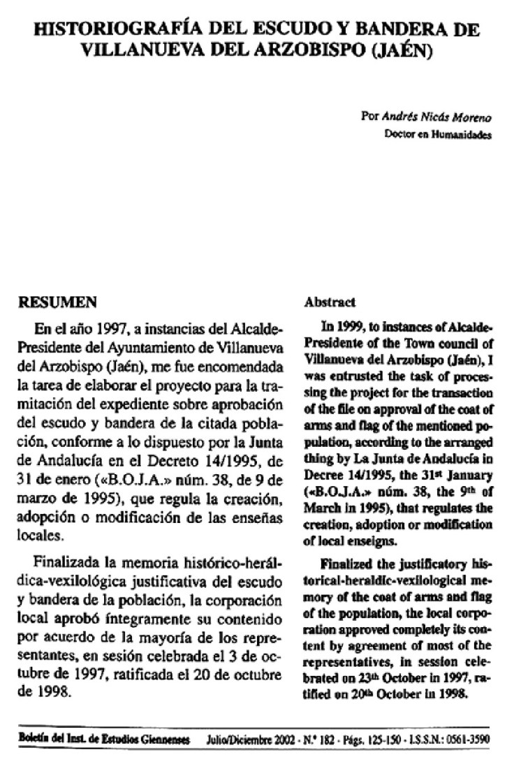 Historiografía del Escudo y Bandera de Villanueva del Arzobispo (Jaén). Historiografía del Escudo y Bandera de Villanueva del Arzobispo (Jaén). Por don Andrés Nicas Moreno, 2002. IR AL DOCUMENTO Comparte esto: Haz clic para compartir en X (Se abre en una ventana nueva) X Haz clic para compartir en Facebook (Se abre en una ventana nueva) Facebook Haz clic para compartir en LinkedIn (Se abre en una ventana nueva) LinkedIn Haz clic para compartir en Tumblr (Se abre en una ventana nueva) Tumblr Haz clic para compartir en Pinterest (Se abre en una ventana nueva) Pinterest Me gusta Cargando...