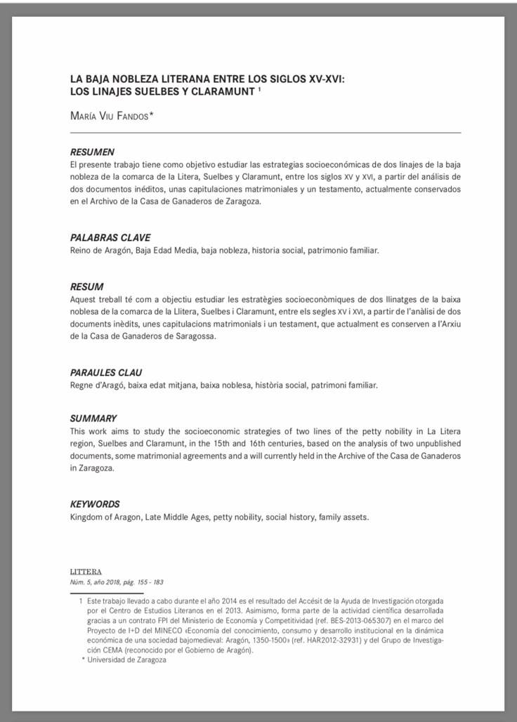 «El trabajo estudia las estrategias socioeconómicas de dos linajes de la baja nobleza de la comarca de la Litera, Suelbes y Claramunt, entre los siglos XV y XVI, a partir del análisis de