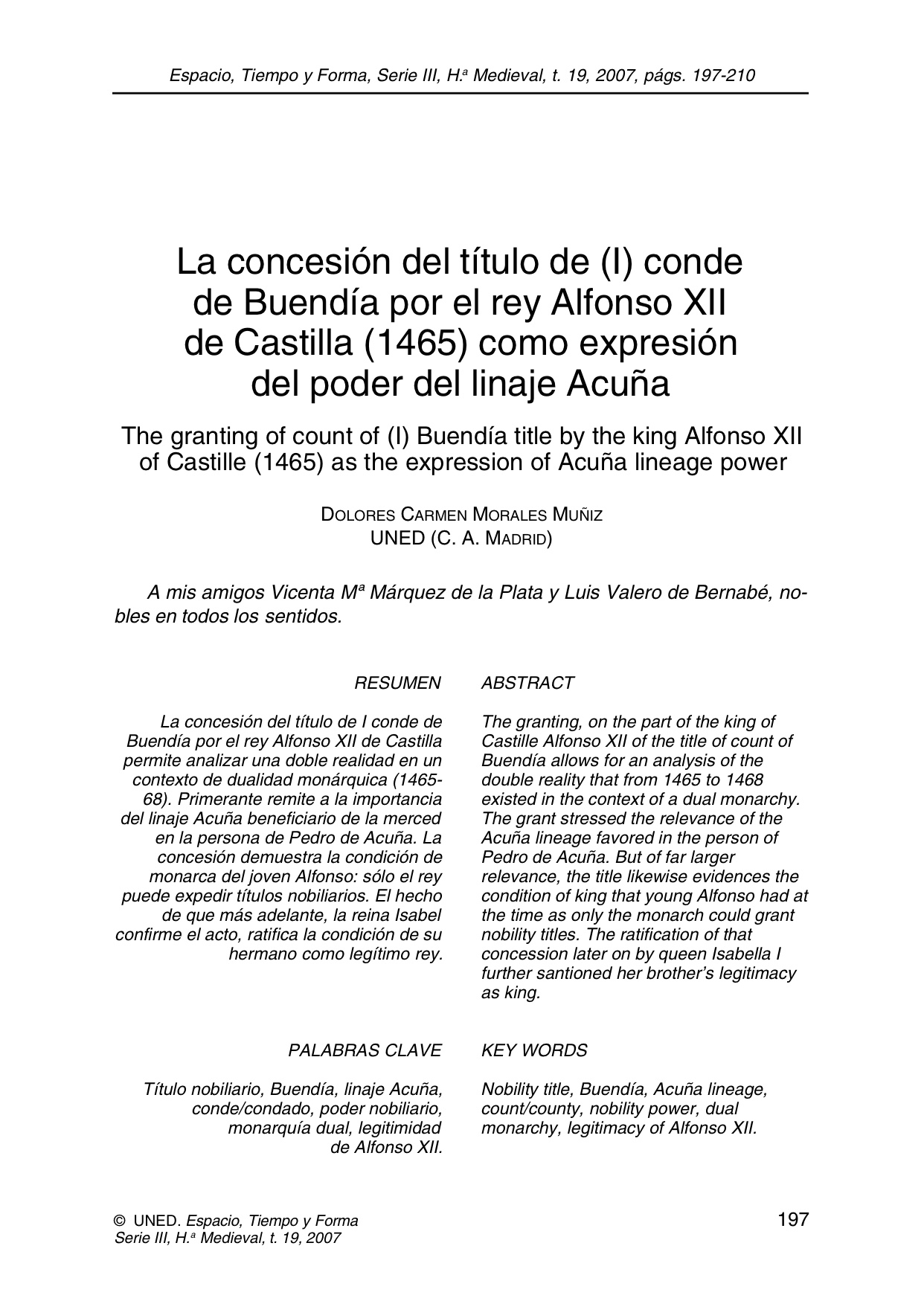 Por doña Dolores Carmen Morales Muñiz en Espacio, Tiempo, y Forma. (Serie III) ,19, p 197-210, 2007.