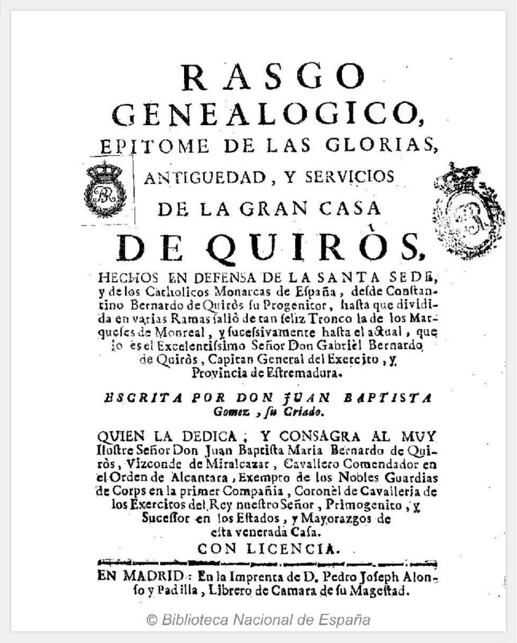 Rasgo genealogico Epitome de las glorias, antiguedad, y servicios de la gran Casa de Quirós …