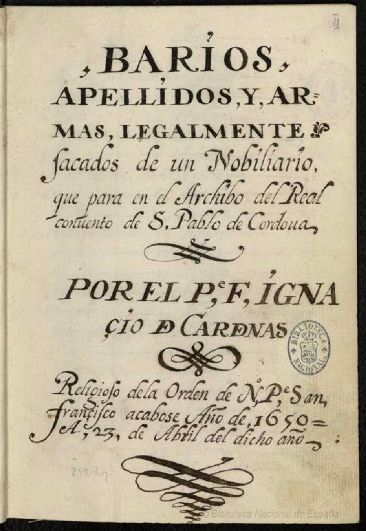 Varios apellidos y armas legalmente sacados de un Nobiliario que para en el Archivo del Real Convento de S. Pablo de Córdoba.
